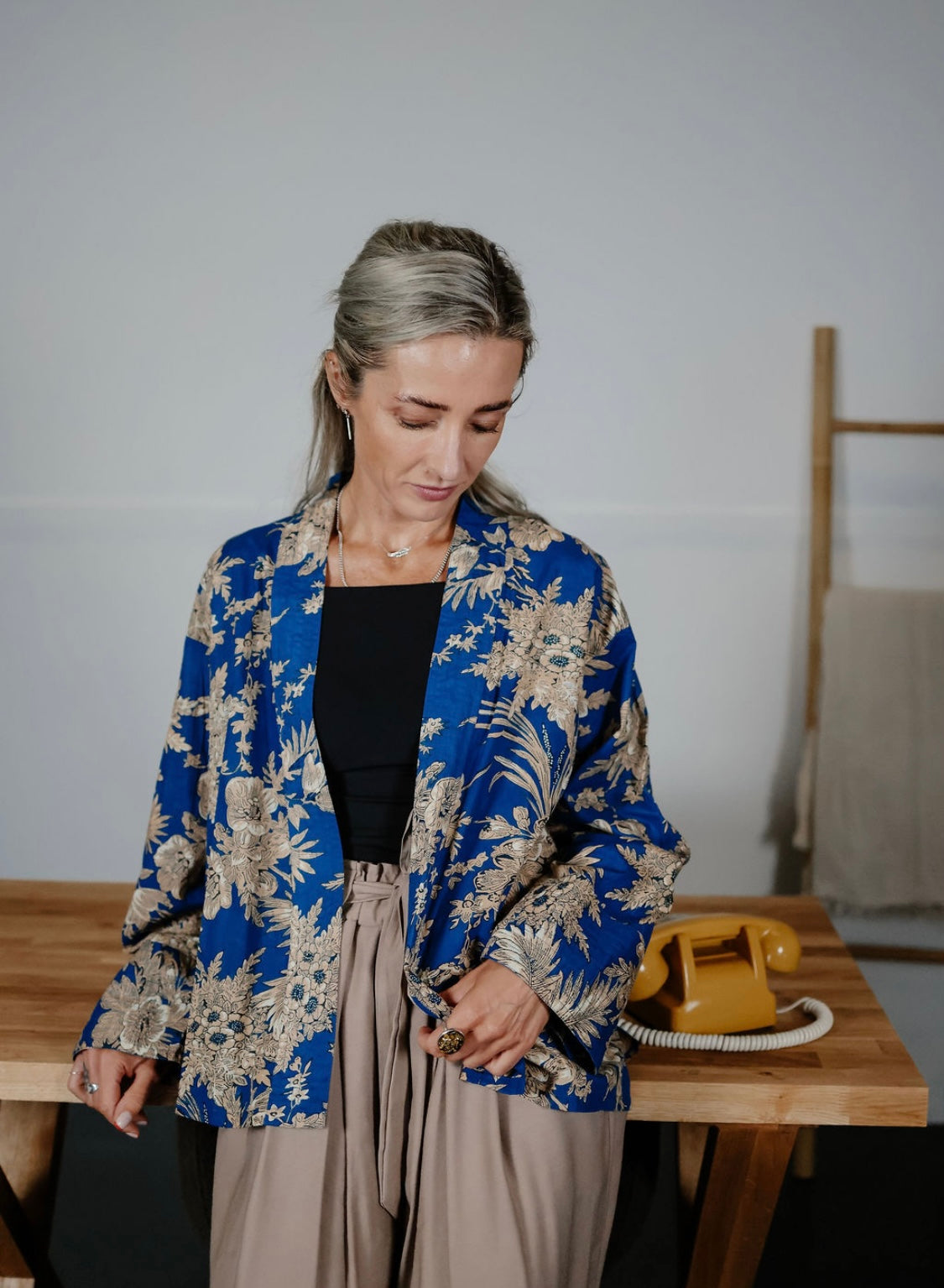 Our bright blue cotton kimono jacket is ideal for those 'jeans and a nice top' occasions. Great paired with a t-shirt or camisole during the summer months and a sweater in cooler weather. The sleeves are full length and are finished with a cuff.