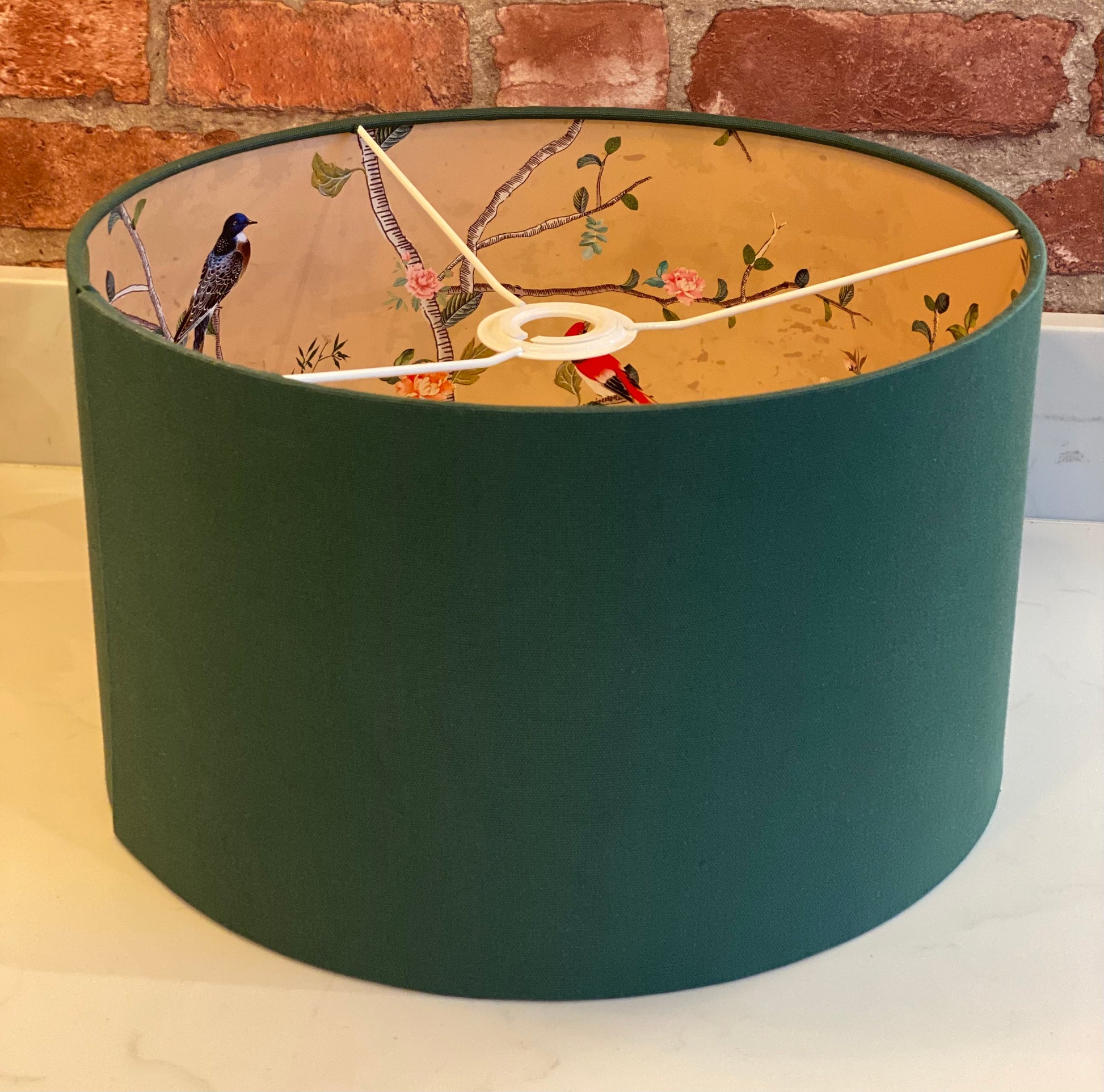 Elevate your lighting with this beautiful dark green linen lampshade, featuring a gold chinoiserie, bird and blossom lining. Your shade will be handmade to order for your ceiling light or lamp in sizes up to 45cm diameter. Whilst we aim to fulfil orders as quickly as possible, please allow up to 10 days. Available for UK and US light fittings.
