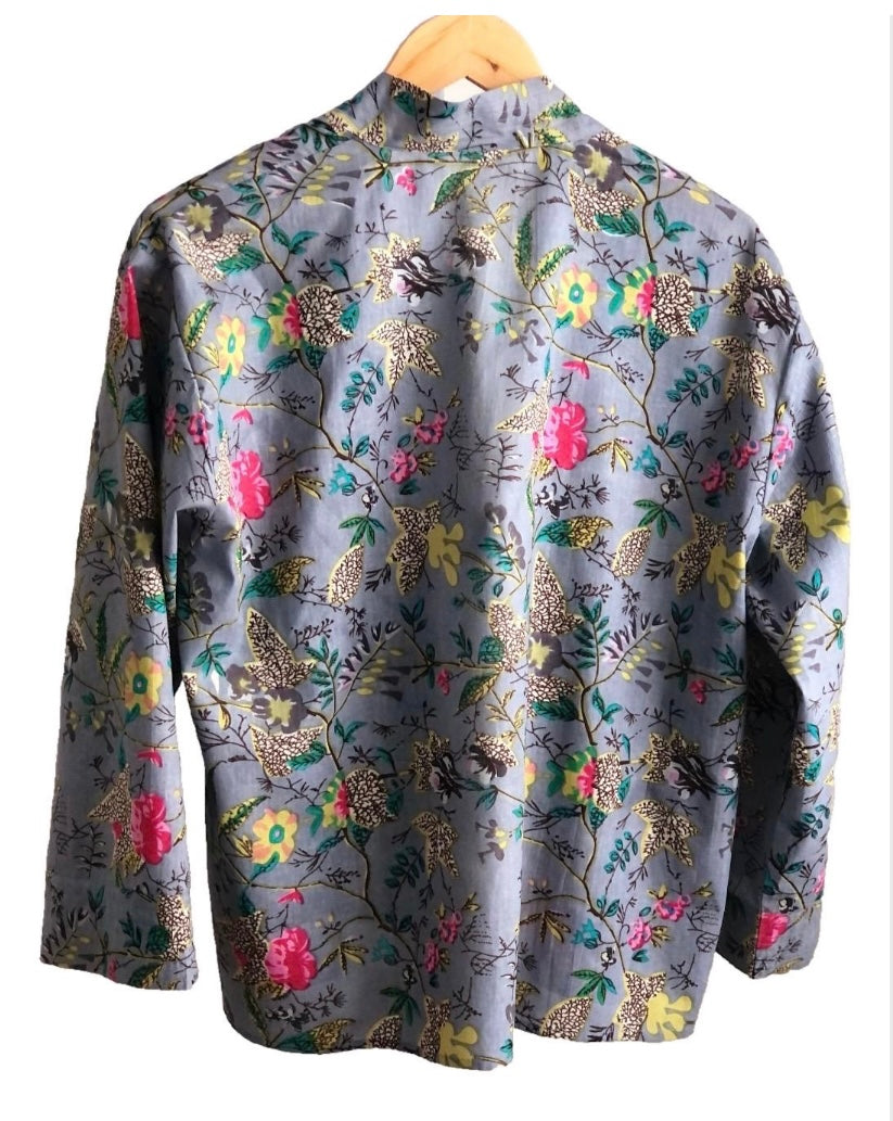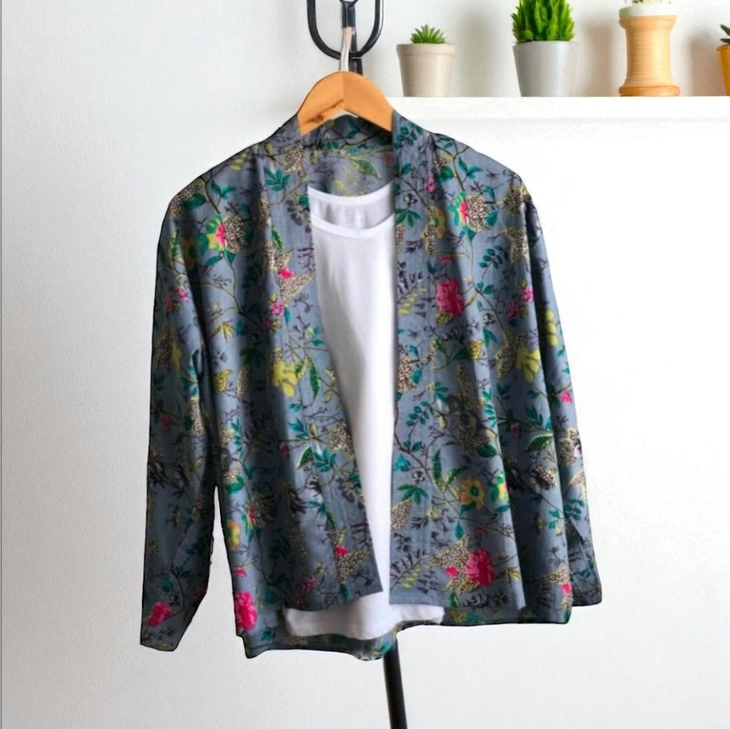 Our dusky blue cotton kimono jacket is ideal for those 'jeans and a nice top' occasions. Great paired with a t-shirt or camisole during the summer months and a sweater in cooler weather. The sleeves are full length and are finished with a cuff.