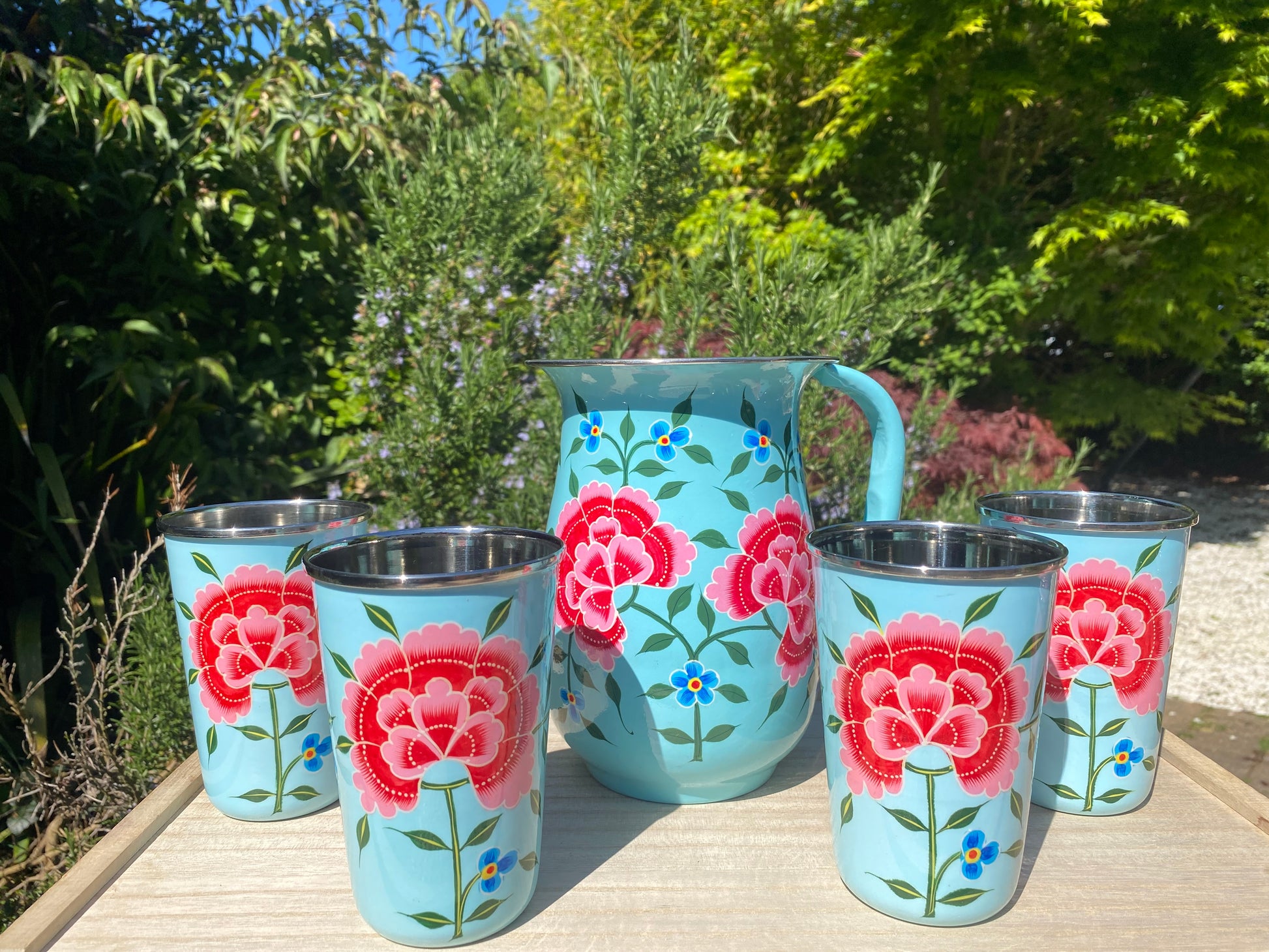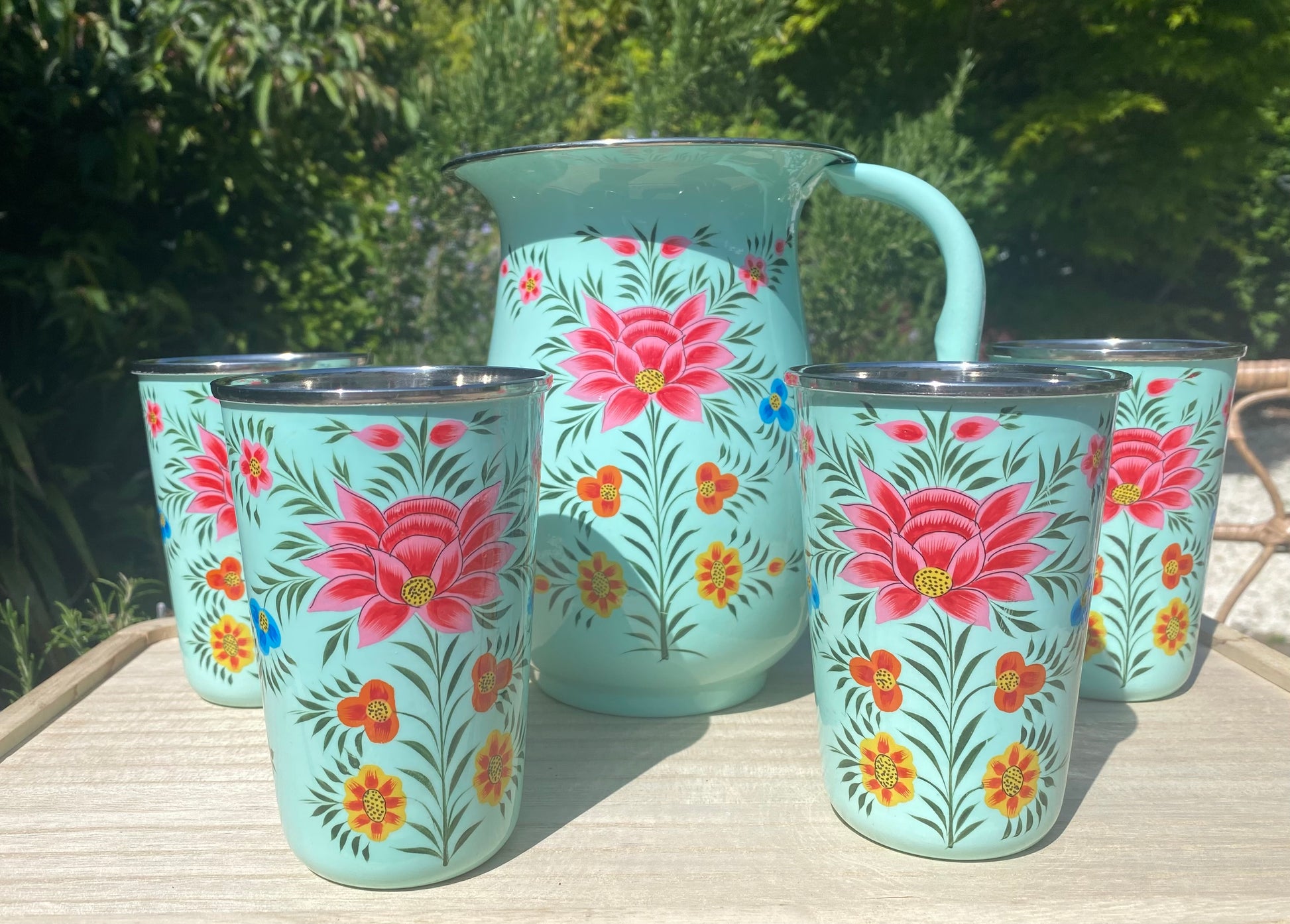 Hand-painted by artisans in Kashmir, this stainless steel and enamel set includes a jug and 4 tumblers. The set is available in a variety of gorgeous colours and designs.