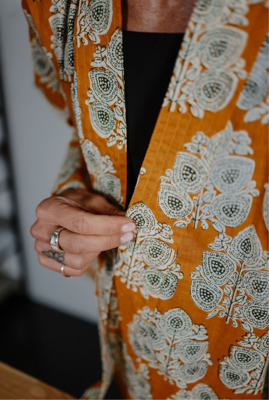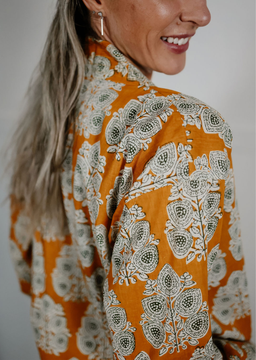 Our mustard yellow cotton kimono jacket is ideal for those 'jeans and a nice top' occasions. Great paired with a t-shirt or camisole during the summer months and a sweater in cooler weather. The sleeves are full length and are finished with a cuff.