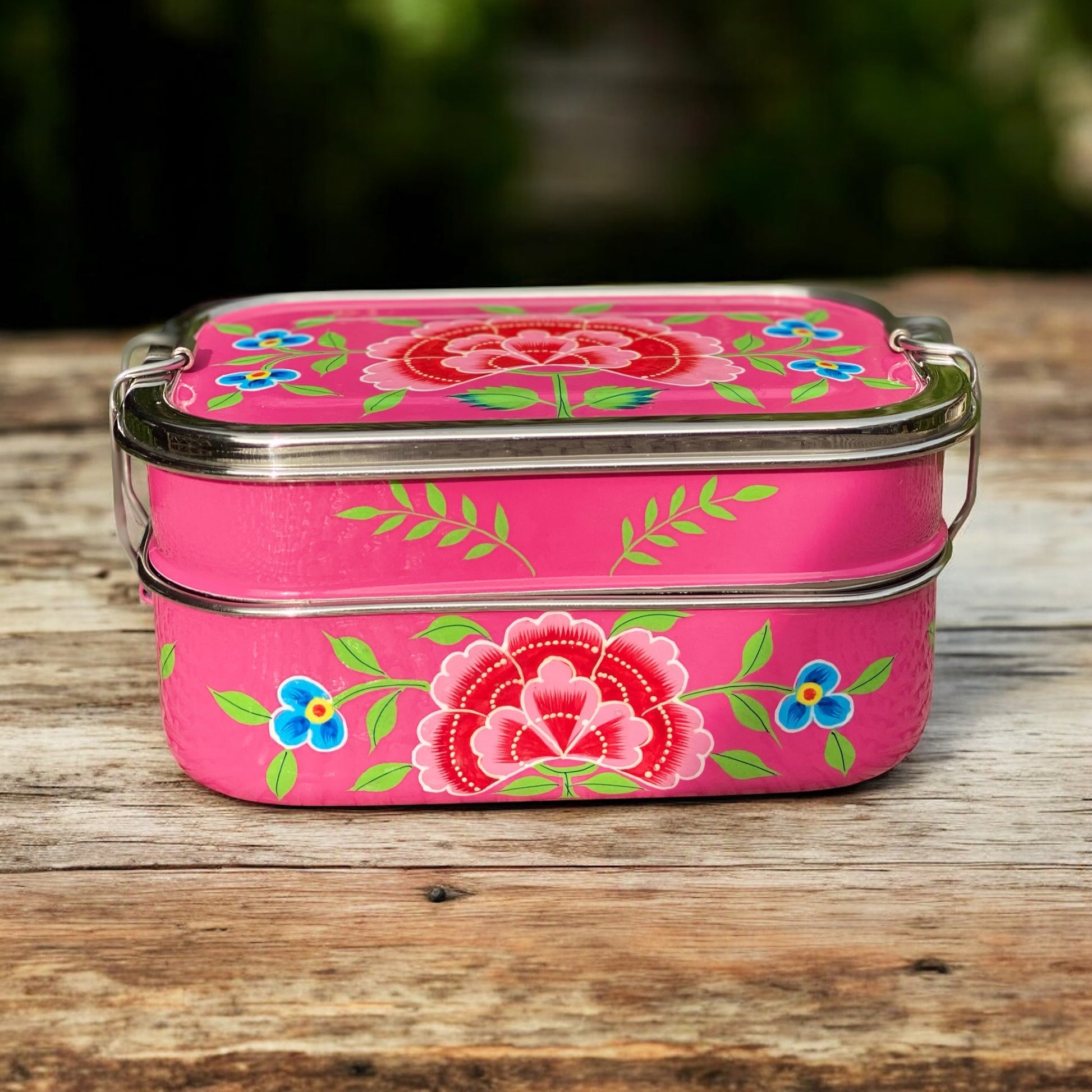 Our stainless steel, tiffin lunchboxes are hand-painted by artisans in Kashmir.