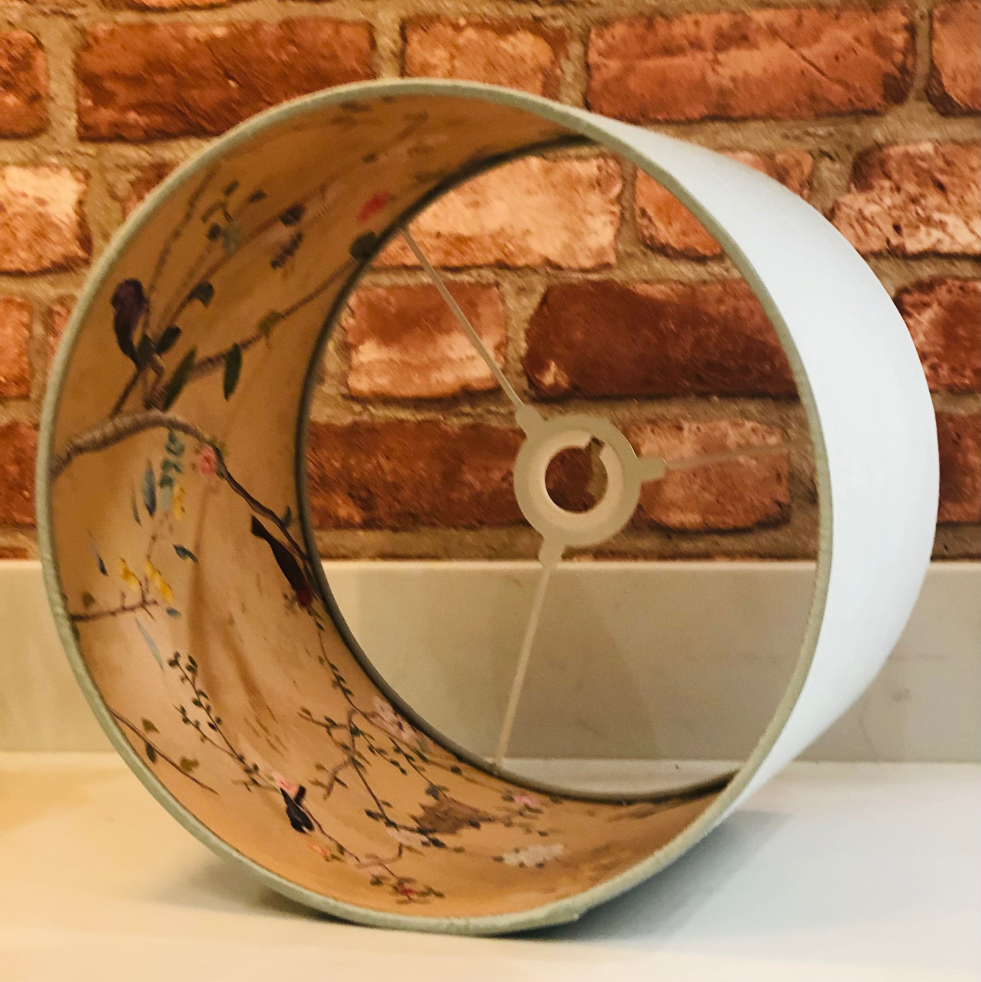 Elevate your lighting with this beautiful pale green linen lampshade, featuring a gold chinoiserie, bird and blossom lining. Your shade will be handmade to order for your ceiling light or lamp in sizes up to 45cm diameter. Whilst we aim to fulfil orders as quickly as possible, please allow up to 10 days. Available for UK and US light fittings.