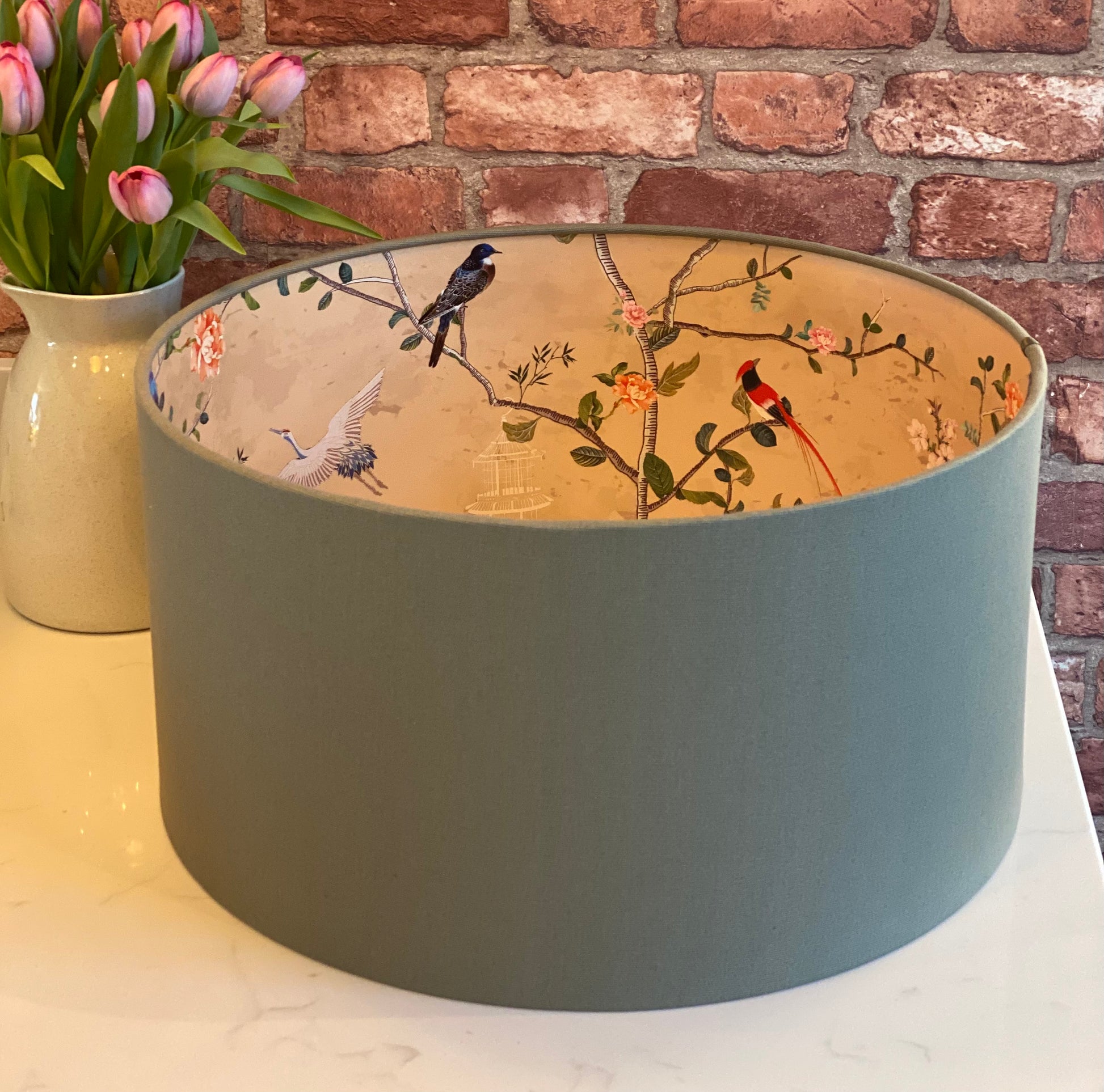 Elevate your lighting with this beautiful sage green linen lampshade, featuring a gold chinoiserie, bird and blossom lining. Your shade will be handmade to order for your ceiling light or lamp in sizes up to 45cm diameter. Whilst we aim to fulfil orders as quickly as possible, please allow up to 10 days. Available for UK and US light fittings.