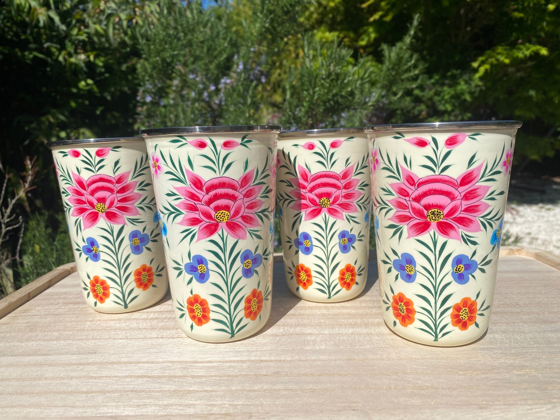 Our stainless steel tumblers are hand-painted by artisans in Kashmir. Ideal for home, garden, days out and camping trips. Food safe and available in a variety of colours and designs.